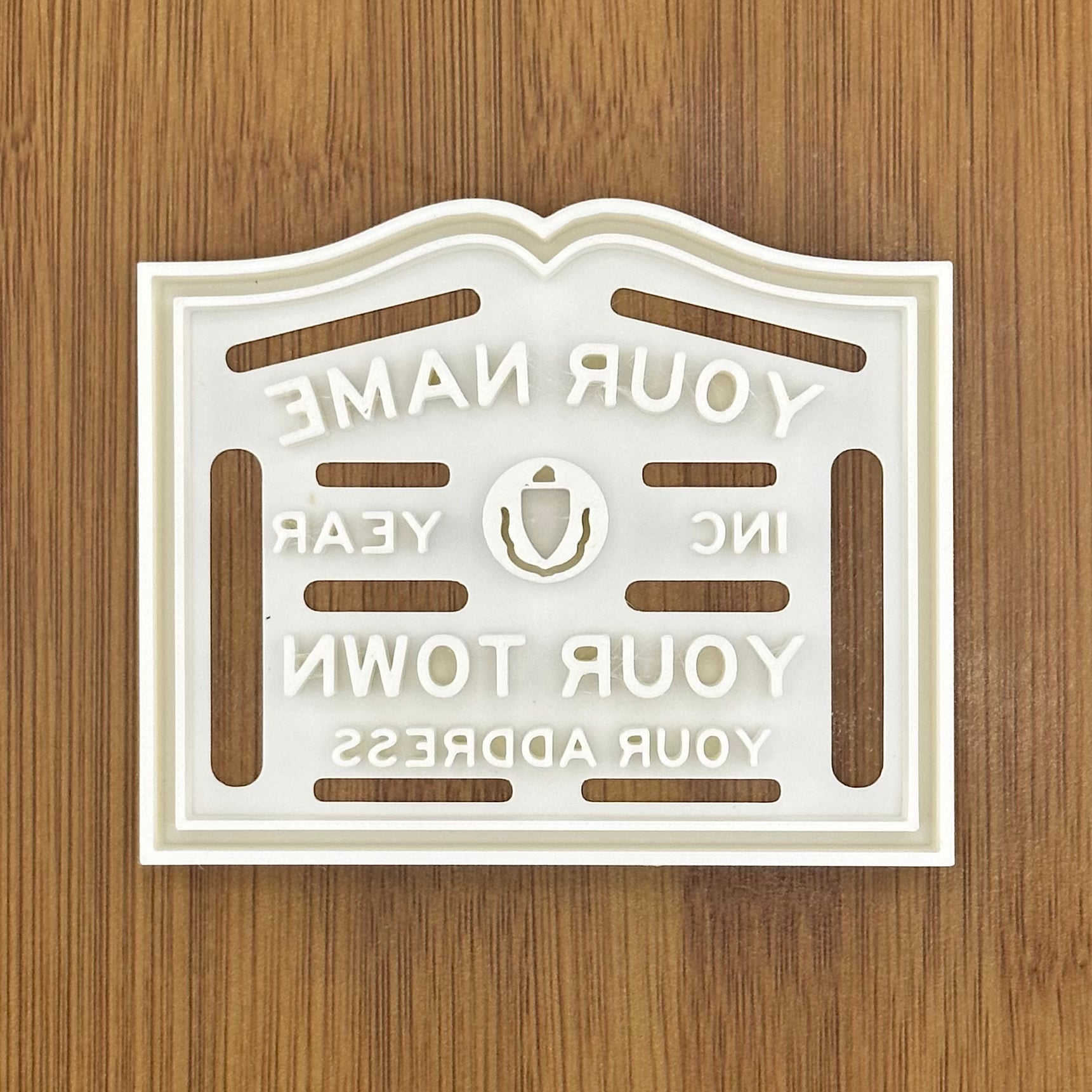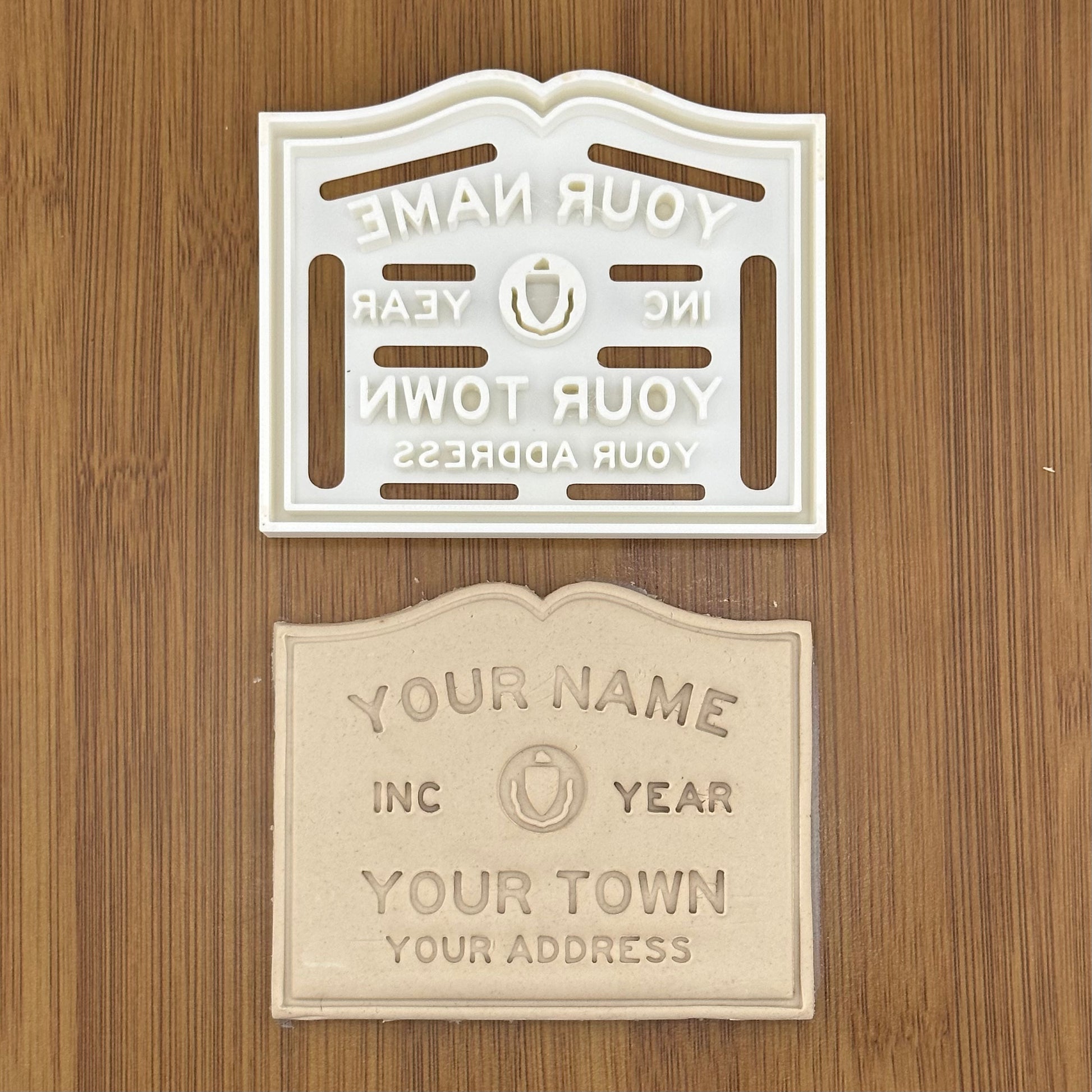 - Four text lines available for personalization: Your Name/Business, Year, Town, Address